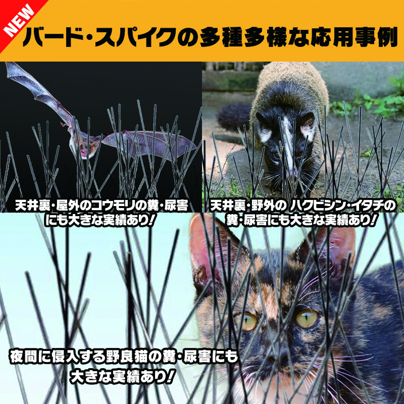 イタチ・ハクビシン・アライグマ・タヌキ・猿を初め、どの害獣・害鳥も、みな、Newバード・スパイクのような“物理的な障害物”を避け寄り付かなくなる『学習能力』を持っているので、Newバード・スパイクは、害獣・害鳥の対策にたいへん効果的で優れています!
