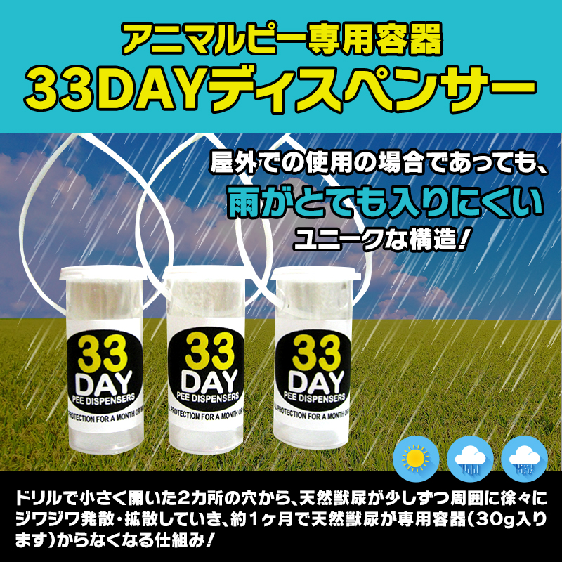 アニマルピー(天然獣尿)専用容器である「33DAYディスペンサー」に約30グラムの天然獣尿を小分けにして入れるだけです。容器に入っている獣尿が周辺に徐々に発散していきます。通常の雨であれば、ディスペンサー内に雨水は入らないユニークな構造になっているので、基本的に、天候には左右されません。ただし、横殴りの大雨時や台風時等には、雨で獣尿が薄まることも考えられるので、再度、補充することをオススメします(通常時で、約1ヶ月(33日間)持ちます)。