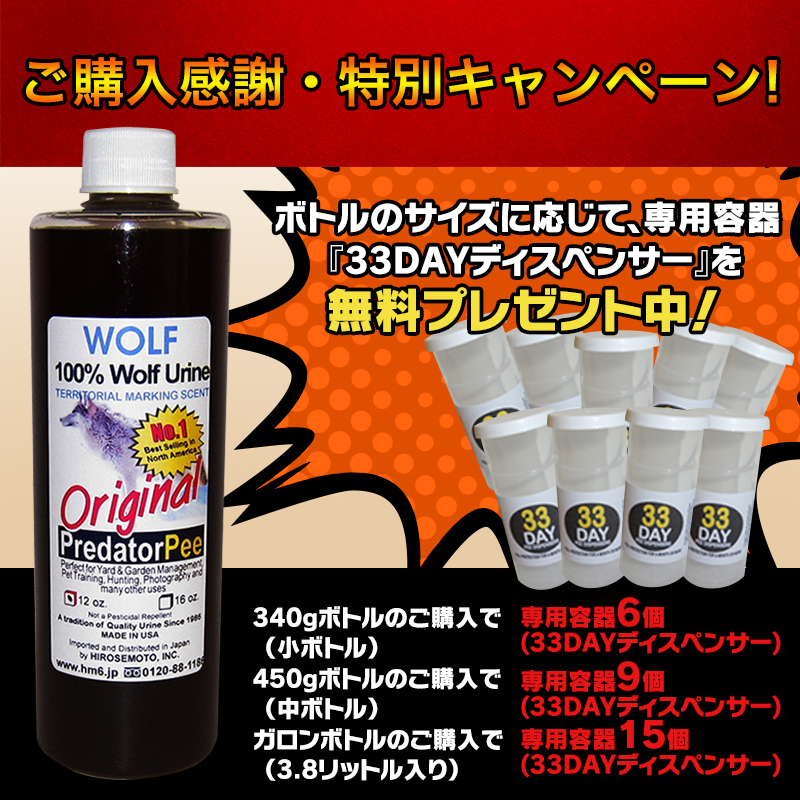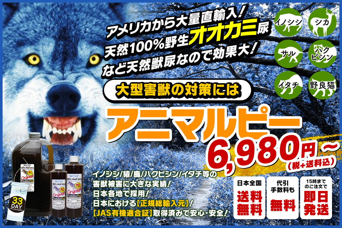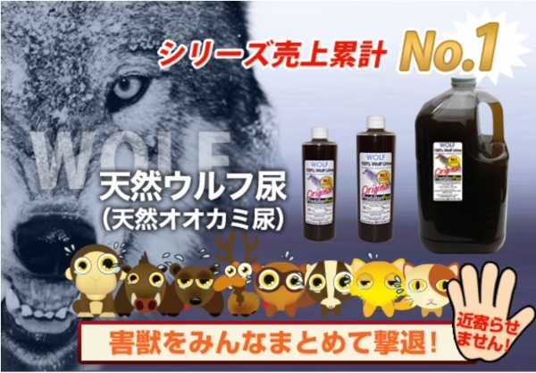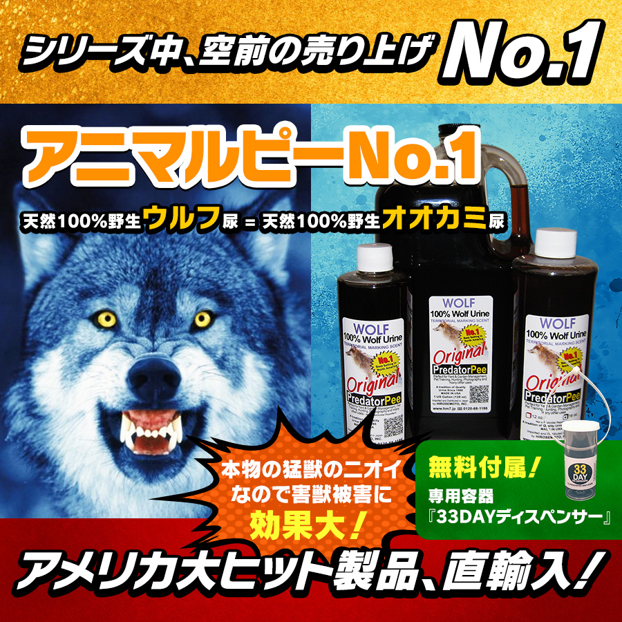 弊社は、『ウルフピー』と全く同じアメリカの会社から、コンテナ船便にて、大量仕入れ・大量直輸入しておりますので、『ウルフピー』他社より、はるかに安価にて、『ウルフピー』と全く同内容・同品質品の純度100%天然尿(原液)の天然ウルフ尿(=天然オオカミ狼尿)を初めとする6種類の獣尿(アニマルピー)や専用容器「33DAYディスペンサー」を『ウルフピー』他社よりも、はるかに格安で販売することが可能となっております。