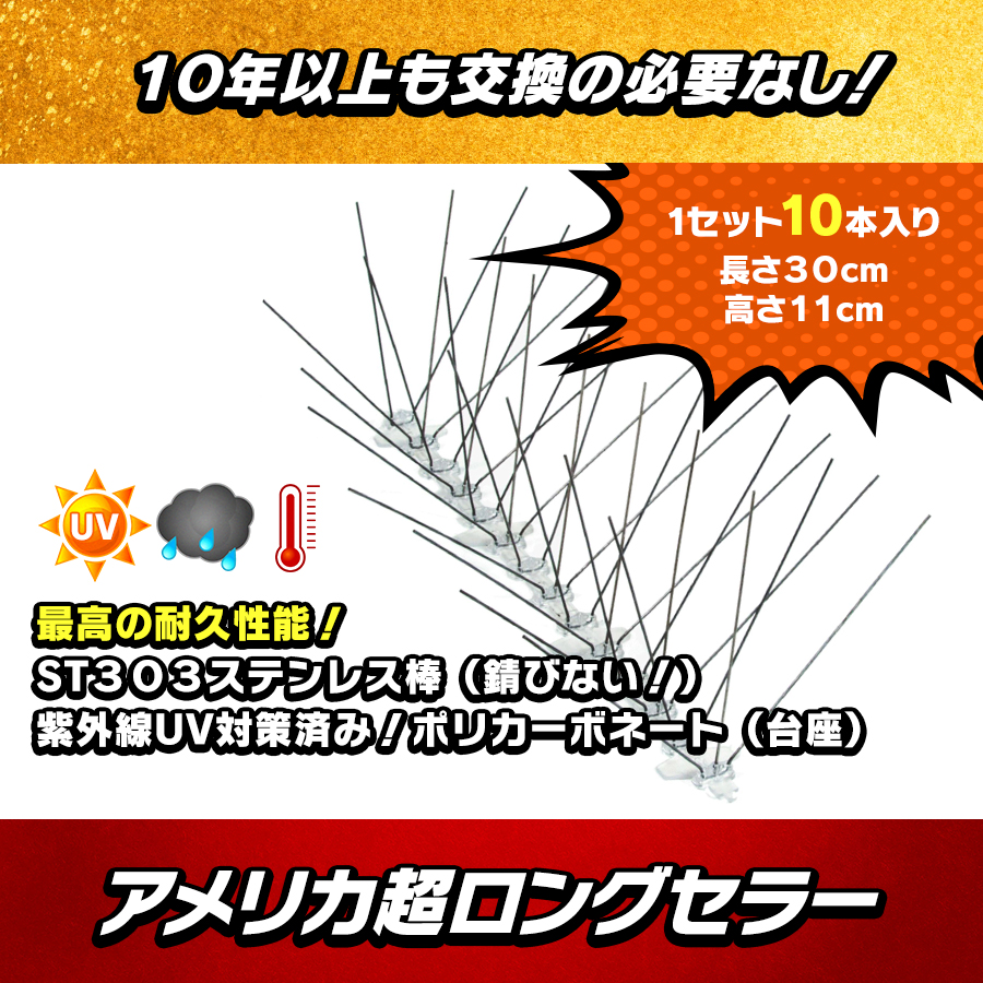 【Newバード・スパイク(STS10)】【耐久性バツグン!紫外線UV対策済みで頑丈!】鹿/イノシシ/猿/ハクビシン/イタチ/ タヌキ/キツネ/コウモリ/野良猫/野良犬/カラス/ハト/ムクドリ/ヒヨドリを駆除/退治/撃退/対策!